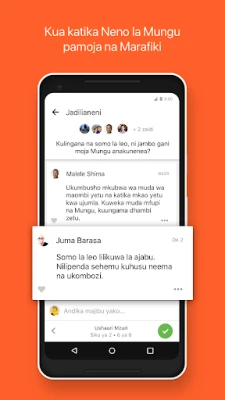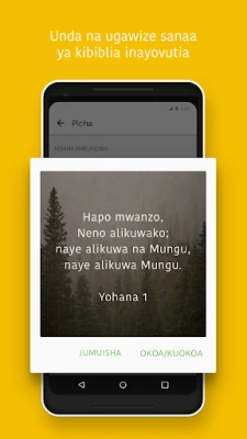 Ungana na marafiki zako na imarishe urafiki wenu kupitia Maandiko Matakatifu. Shiriki uvumbuzi wako wa kiroho, toa maoni, na uliza maswali mnapojifunza kweli za Biblia pamoja. Furahia mazungumzo ya wazi kuhusu imani yenu, na kusherehekea majibu ya maombi mnaposhuhudia Mungu akijibu. Unaweza pia kuunda picha za kuvutia za mistari ya Biblia na kuzishiriki kwenye mitandao ya kijamii, barua pepe, au ujumbe mfupi. Mbali na maandishi, chunguza video za kufundisha kutoka Mradi wa Biblia, Mradi wa Lumo, na filamu ya YESU, zote zikipatikana kukusaidia kuelewa zaidi Neno la Mungu.